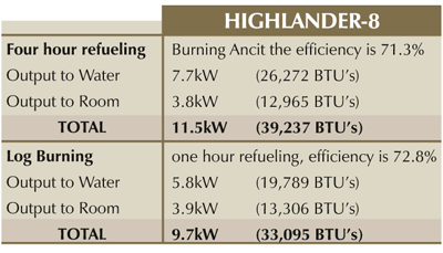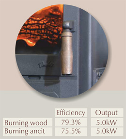 The Highlander Enviro-burn 5 has two combustion controls. The most ideal setting will quickly be found moving the slide slowly to find the most suitable position. Using the correct rate of burning, efficiencies of up to 79.3% burning wood logs can be achieved.