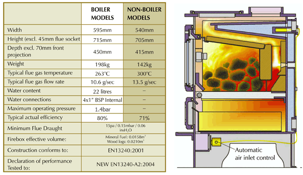 Emmisions from the Yorkshire Stove are so low that it very easily complies with the clean air act (see graph on the technical spec page). Independent laboratory tests show efficiencies of over 70% on a whole range of fuels including wood.